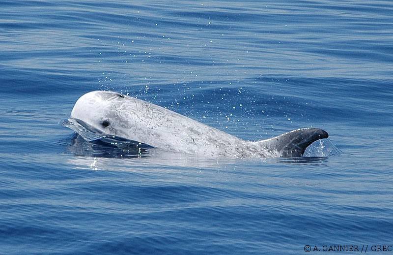 Le dauphin de Risso (Grampus griseus) est un cétacé odontocète appartenant à la famille des Delphinidés. Il se distingue par son corps massif, son melon proéminent et surtout par sa peau recouverte de cicatrices blanches, témoins de conflits ou jeux sociaux.