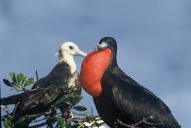 La saison de reproduction est marquée par un intense rituel de séduction. Les mâles gonflent leur sac gulaire rouge et émettent des claquements bectaux, perchés en hauteur pour se rendre plus visibles.
